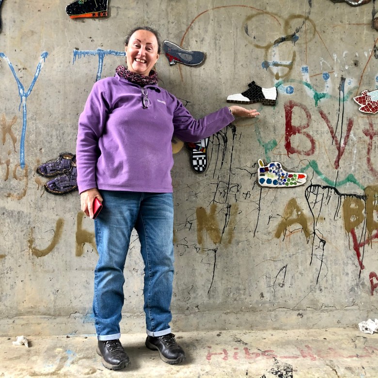 The morning after the installation, Marion brought her husband to the bridge to show him the mosaics. She was devastated to find that some of the shoes had been damaged and two of the children’s shoes had been ripped off the wall completely.