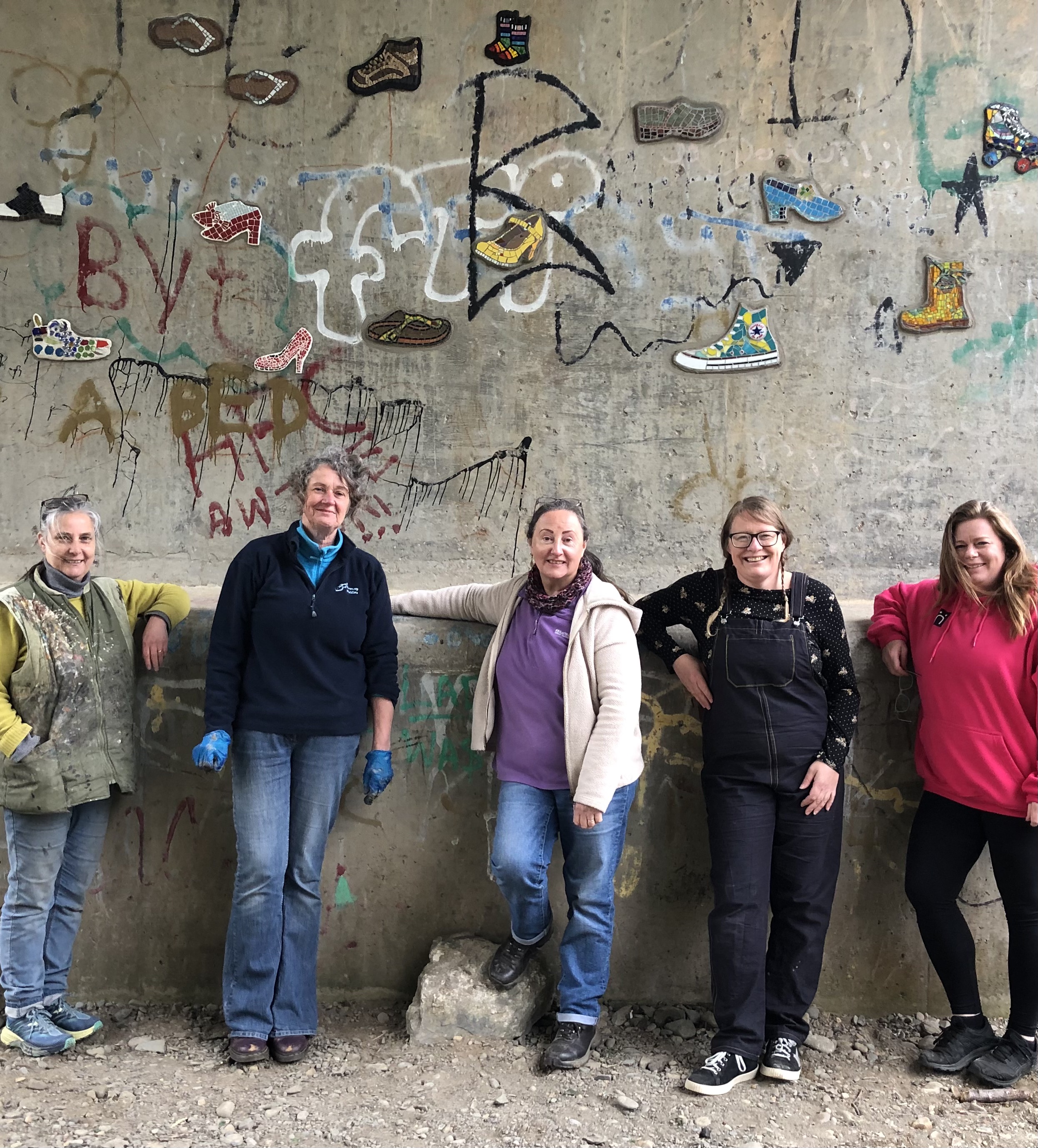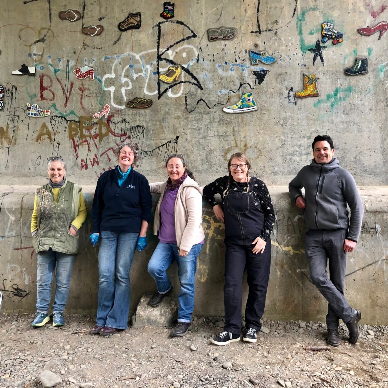 She was joined by four other Scotland-based mosaic artists – Katy Jackson, Sara Melville, Marion Ross and me – along with willing helper Ross McKellar, to fix the shoes onto the graffiti-splattered bridge wall.