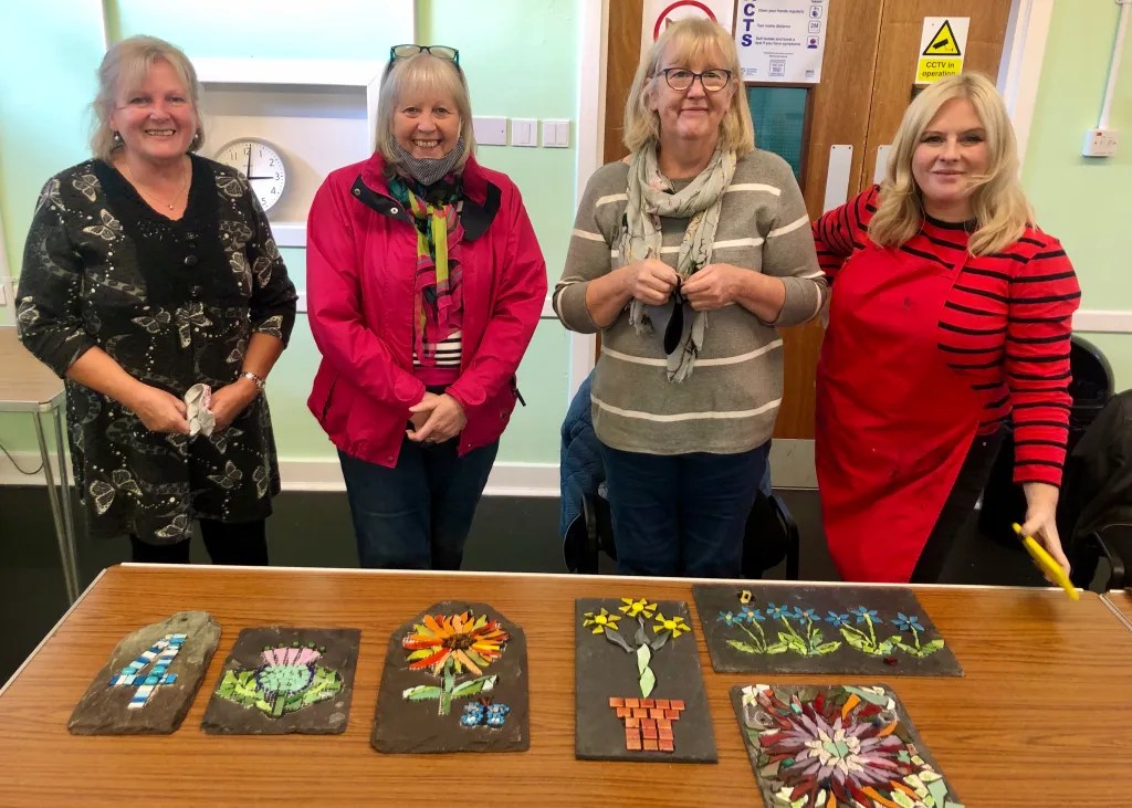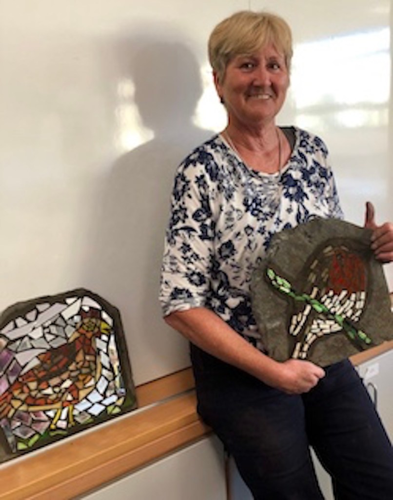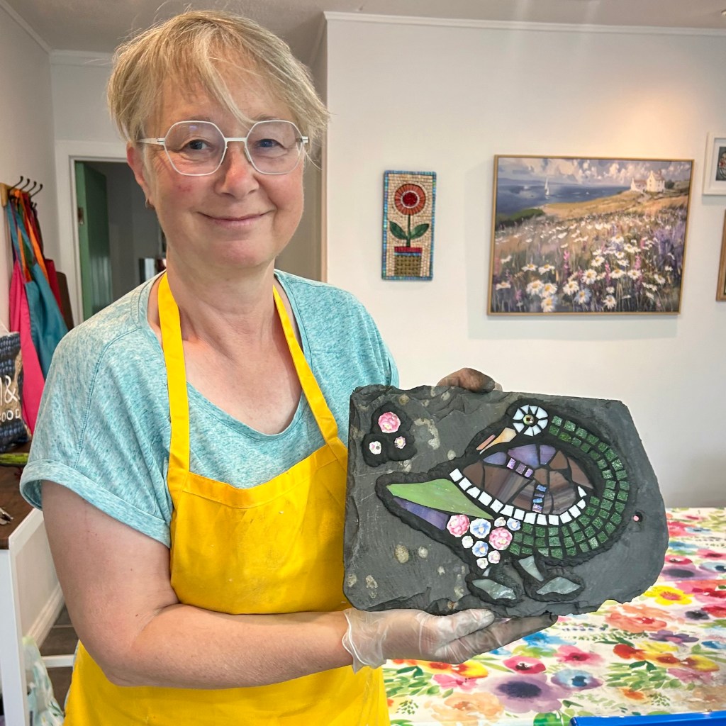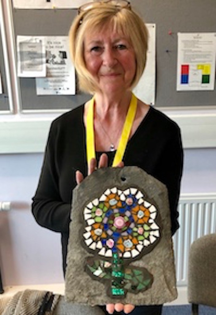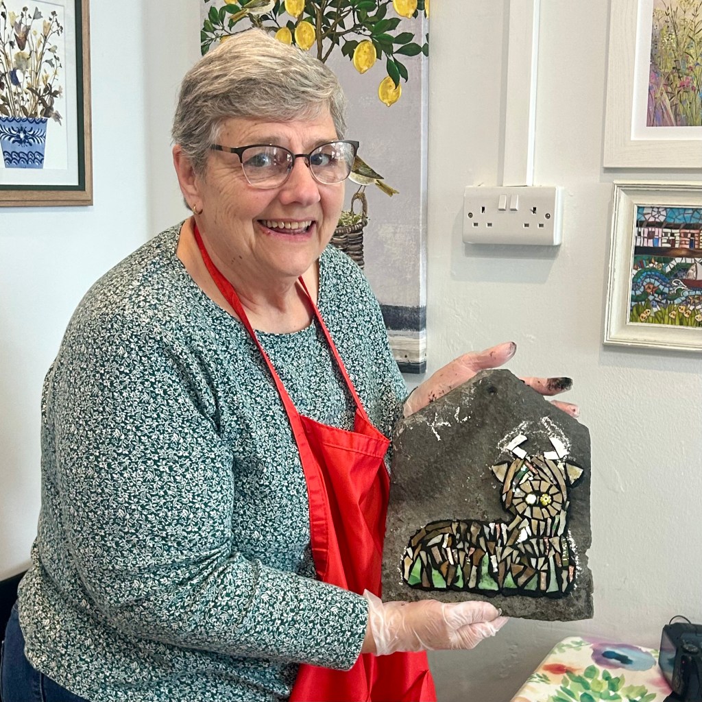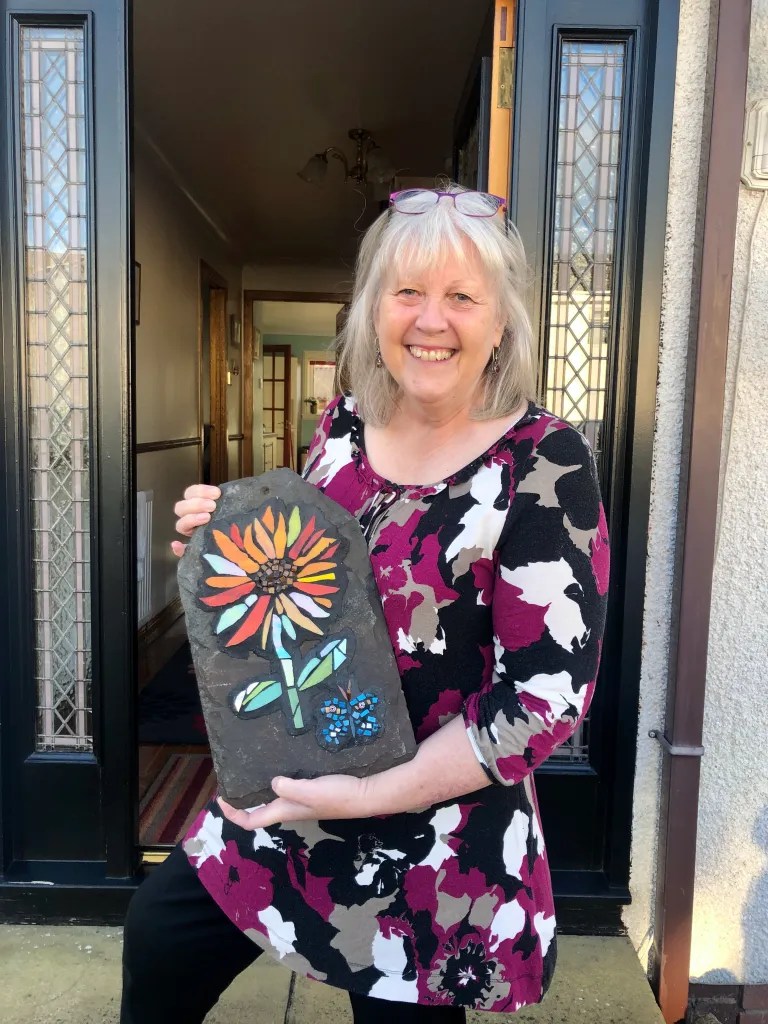 Rhona has been teaching picasiette / mixed-media mosaic in Central Scotland for over ten years. She loves sharing her passion, coaching her students, helping them create their designs, and encouraging them to learn from each other. It’s always a lovely group of people who come together – sometimes people come with friends or as a couple, or sometimes on their own for some ‘me’ time or to meet new people. Rhona enjoys seeing the joy and satisfaction they get from the pieces they create – especially when they surprise themselves if they think they’re not naturally artistic!
